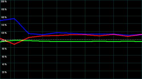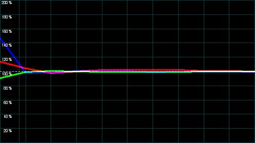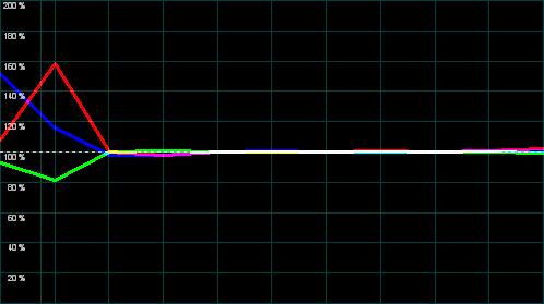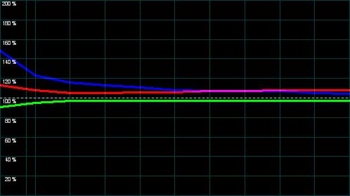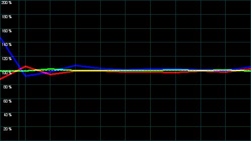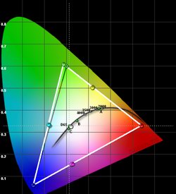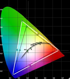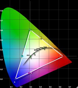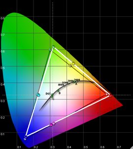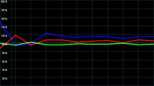 Wichtig für die Farbdarstellung ist vor allem auch die Weißmischung (R+G+B) auf die von der Videonorm vorausgesetzte Farbtemperatur von 6500K / D65. Diese Abstimmung fällt ab Werk selten perfekt aus, sollte aber zumindest durch die Bildparameter ermöglicht werden können. Hier sind die Ergebnisse durchwachsen.