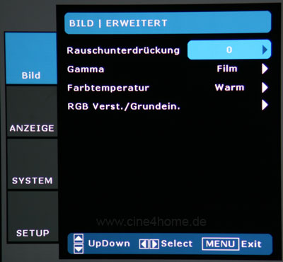 Nicht ganz so üppig und ausgefeilt wirkt das Menüssystem des Optoma Projektors. Die grafische Aufbereitung ist etwas antiquiert und auch die gebotenen Optionen erreichen bei weitem nicht die Vielseitigkeit des Epson TW2900.