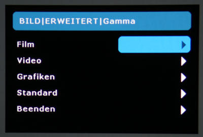 Bei Optoma ist das System der Gammaeinstellung ähnlich: Im erweiterten Bildmenü kann der Anwender zwischen verschiedenen Presets wählen, diese sind aber nicht mit ihrem numerischen Anstieg angegeben, sondern nach Einsatzzweck umschrieben.