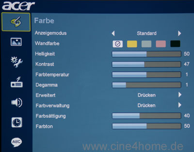 Bei der Farbtemperatur rächt sich die spartanische Menügestaltung des Acer Beamers. Ab Werk zeigt sich auch bei ihm ein Blau- / Rotstich im "Film" Preset.