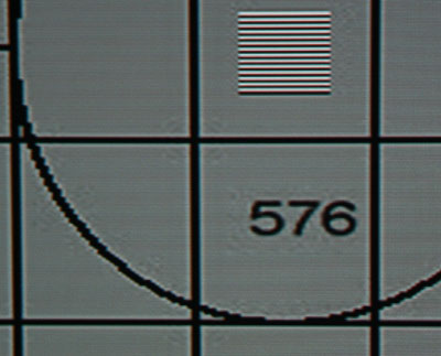 So artefaktfrei hat sich obiges Testbild bisher nur selten auf der Leinwand gezeigt. Linearitätsschwankungen liegen auf einem unmerklichen Niveau, wodurch gerade vertikale Kameraschwenks in Film und Fernsehen deutlich profitieren. Sogar einzeilige Details (Bild oben) werden ohne Artefakte auf der Leinwand abgebildet. Hier kann kein 720p Projektor mithalten, ja sogar manche PAL-native Projektoren nicht.