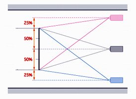 Bei Bildmaterial im 4:3 "Fernsehformat" bleibt ein Teil der horizontalen Auflösung ungenutzt. Wie bei einem herkömmlichen 16:9 Fernseher erscheinen links und rechts vom Bild schwarze Balken. Die "übrig gebliebene" Auflösung liegt aber immer noch deutlich über unserem PAL Standard, auch bei 4:3 Material ergibt sich daher kein Defizit in der Detaildarstellung.
