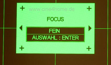 Im Lens-Menü kann der Anwender zwischen kleinen und großen Schritten wählen und so das Bild feinfühlig passgenau auf die Leinwand ausrichten. Bei "Fein" ist eine genaue Justage auf die perfekte Bildgröße und Schärfe möglich, bei "normal" laufen die Motoren stufenlos.