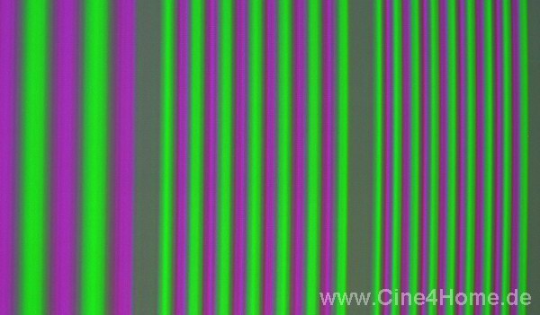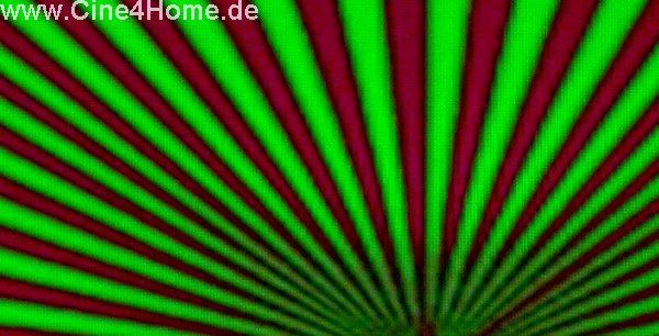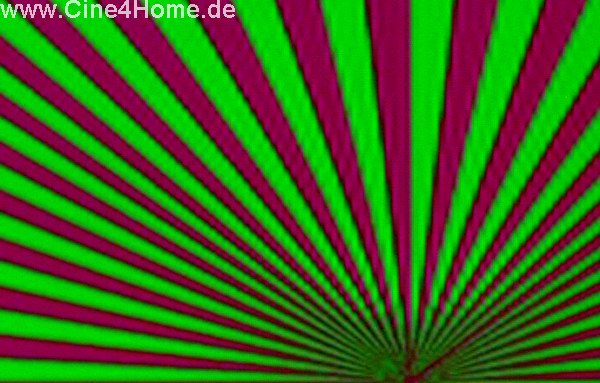 Die farbigen Strahlen zeigen keine geraden Kanten, sondern sind deutlich ausgefranst. Je detaillierter der Bereich, desto auffälliger die Ausfransungen. Im Filmbetrieb leiden hierunter besonders kleine farbenkräftige Details, wie sie in Animationsfilmen oft vorkommen. Besonders ausgeprägt ist dieser Fehler bei der 576p Zuspielung. Aber auch bei 720p ist er noch zu erkennen:
