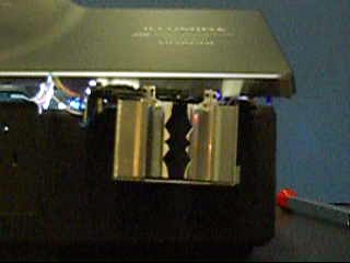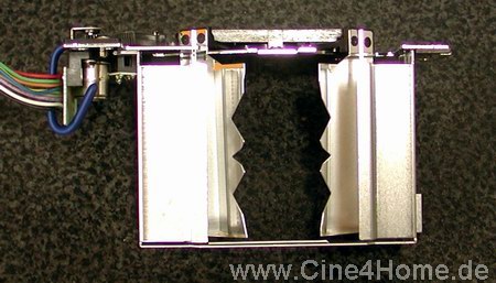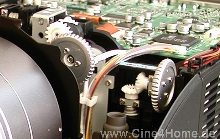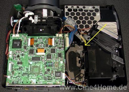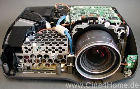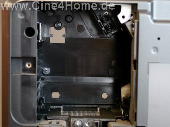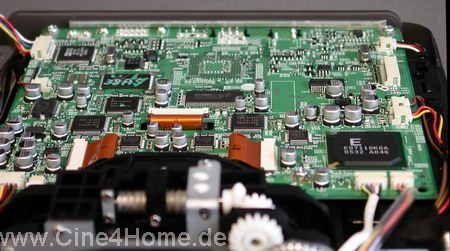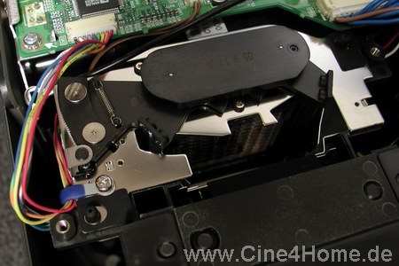 Natürlich haben wir die Funktionsweise der neuen Technik "in natura" untersucht. Mit Schraubenzieher und Unterstützung von Karsten Becker (www.dvdplayer.de) haben wir dazu einen Blick ins Innere geworfen. Nach dem Öffnen des Deckels ergibt sich ein erster Blick auf ein gut strukturiertes Inneres: Im Bild zu erkennen ist das Netzteil (vorne), die Steuerplatine und Lampenkammer (hinten links).