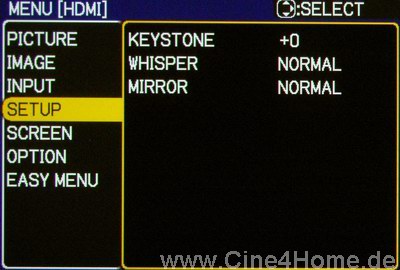 Rubrik Nr.4 , "Setup" beinhaltet nur die Funktionen, die zur Bildausrichtung bei der Installation notwendig sind. Hier kann zwischen Front- und Rückprojektion gewählt sowie in dem seltenen Fall einer schrägen Aufstellung ein Trapezausgleich vorgenommen werden. Auch der Lampensparmodus kann hier aktiviert werden.