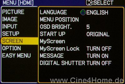 Die Rubrik "Screen" hat einen etwas missverständlichen Namen: Sie beschäftigt sich nicht mit dem Bild auf der Leinwand, sonderm mit den On-Screen-Menüs.