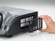 Wie jeder Filter sollte auch der des TX200 regelmäßig gereinigt werden. Zu diesem Zweck muss er aus seiner Halterung gelöst werden, was dank der seitlichen Positionierung schnell und unkompliziert von der Hand geht. Besonders bei der Deckenmontage wird der Anwender schnell zu schätzen wissen, dass der Projektor hierfür nicht von der Halterung gelöst werden muss.