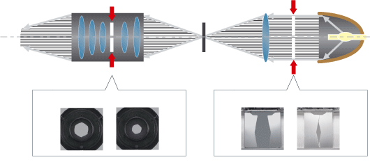 Öffnet sich die Blende, so gehen die Türen soweit auf, dass sie nicht mehr im Lichtweg stehen. Somit kann die maximale Lichtmenge in den Lichtweg und auf die Leinwand gelangen.