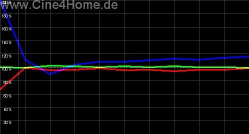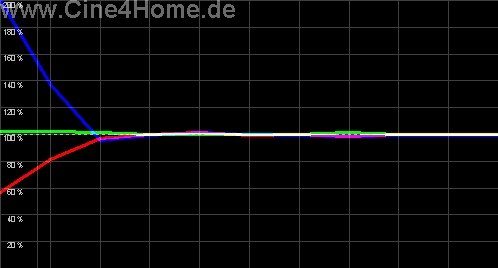 Das Diagramm oben zeigt auf der X-Achse die Bildhelligkeit (von dunkel (links) bis hell (rechts)) und auf der Y-Achse die prozentuelle Abweichung der einzelnen Grundfarben vom Optimum (Mitte-100%). Man erkennt deutlich, dass der Projektor in fast allen Helligkeiten einen gewissen Blauüberschuss aufweist, während Rot und Grün gut aufeinander abgestimmt sind.