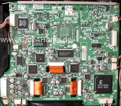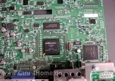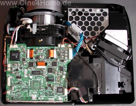 Mit Schraubenzieher und Unterstützung von Karsten Becker (www.dvdplayer.de) haben wir wie immer einen Blick ins Innere geworfen. Nach dem Öffnen des Deckels ergibt sich ein erster Blick auf ein gut strukturiertes Inneres: Im Bild zu erkennen ist das Netzteil (vorne neben der Optik), die Steuerplatine und die Lampenkammer (unten).