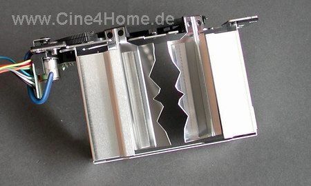 Öffnet sich die Blende, so gehen die Türen soweit auf, dass sie nicht mehr im Lichtweg stehen. Somit kann die maximale Lichtmenge in den Lichtweg und auf die Leinwand gelangen.