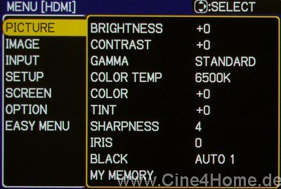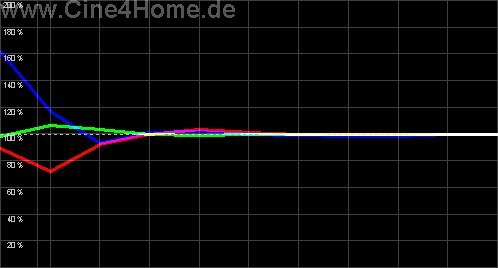 Mit den Reglern ist, wenn man die passenden Messinstrumente zur Verfügung hat, eine Kalibrierung äußerst einfach. Hinteinander stimmt man helle, mittlere und dunkle Graustufen voneinander getrennt ab. Die Interaktionen der einzelnen Regler liegen auf einem gut berechenbaren Niveau. Lediglich in den Bereichen unter 20IRE weist der Projektor noch den LCD-typischen Blaustich auf. Dies ist aber in der Regel nicht so relevant, da das Auge in den dunklen Bereichen weniger stark auf Farbverschiebungen reagiert, als in hellen. Die Werkseinstellung des 6500K-Presets ist in Anbetracht der der stärker werdenden Konkurrenz nicht mehr ganz zeitgemäß. Hervorragend sind aber die Möglichkeiten zur nachträglichen Optimierung, sie erlauben dem Nutzer oder Fachhändler eine nachträgliche Justage.