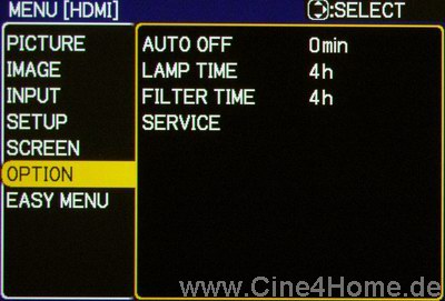 Zusätzliche Optionen bietet das gleichnamige "Options"-Menü: Neben Informationen zur Lampen- und Filterlaufzeit wurde hier das neue Service-Untermenü integriert.