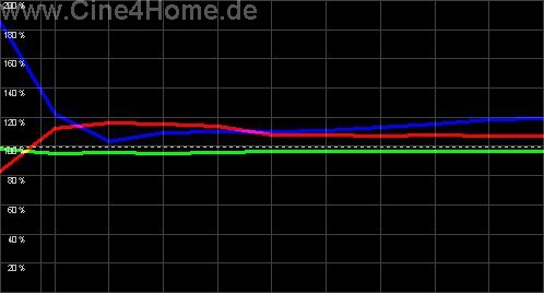 Das Diagramm oben zeigt auf der X-Achse die Bildhelligkeit (von dunkel (links) bis hell (rechts)) und auf der Y-Achse die prozentuelle Abweichung der einzelnen Grundfarben vom Optimum (Mitte-100%). Man erkennt deutlich, dass der Projektor in fast allen Helligkeiten einen gewissen Blau- und Rotüberschuss aufweist. Das Filmbild wird dadurch in der Farbdarstellung verfremdet, wer mehr Präzision wünscht, muss selbst Hand anlegen: Identisch zum TX200 bietet der PJ-Tx300 wieder das hervorragende Equalizer-Konzept: Zusätzlich zu den üblichen Gain- und Biaseinstellungen können auch die mittleren Helligkeitsbereiche getrennt beeinflusst werden.