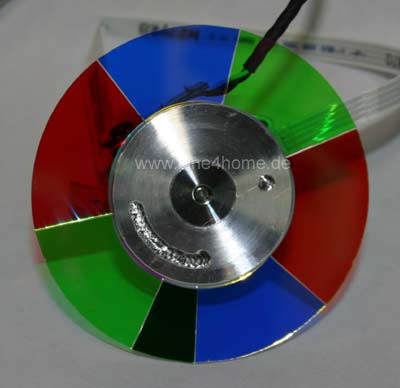 Das Infocus-Farbrad ist klassisch aber durchdacht: Die Rotsegmente sind deutlich vergrößert, um den Rotmangel der UHP-Lichtquelle auszugleichen und den Projektor so farblich auf die D65-Norm zu trimmen. Ein spezielles Dunkelgrünsegment sorgt zudem dafür, dass dunkle Bildpartien kein störendes Bildrauschen aufweisen. Bessere Farbräder sind derzeit kaum zu konstruieren, vorausgesetzt, die Farbtöne sind angemessen gewählt, was wir im Bildteil untersuchen werden.