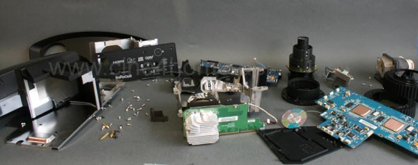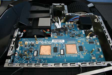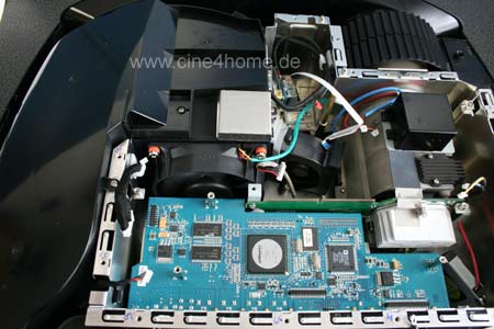 Nimmt man den großen runden Deckel des Beamers ab, so fällt direkt die große Steuerplatine der DMDs ins Auge. Dennoch beinhaltet sie nicht die gesamte Elektronik, eine Zusatzplatine sorgt für die Signalverarbeitung des Projektors. FullHD-Projektoren sind sehr komplex in der Ansteuerung des DMD-Chips, müssen doch für rund 2 Millionen Spiegel individuelle Kippspiegel-Frequenzen verwaltet werden.