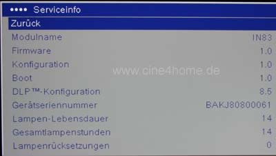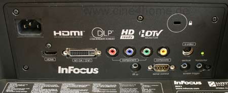 6. Die wichtigsten technischen Daten im Überblick (Herstellerangaben): - Native Resolution: Full HD 1080p (1920 x 1080) - Display Technology: DarkChip4 DLP® by Texas Instruments™ 7-segment (RGBRGBndG) color wheel - Brightness: Video Optimized 1600 Max ANSI lumens (1400 typical) SMPTE brightness up to 15.25 ft (4.6m) diagonal/1.0 gain screen - Contrast Ratio: 5000:1 native (Max 15,000:1 using iris) - Video Processing: Digital Natural Expression™ (DNX) by Pixelworks™ 10-bit video decoder with Motion Adaptive De-Interlacing, Rich Color Processing, Video Enhancement Processing, Noise Reduction - Color Features: Up to 1.07 billion displayable colors with Deep Color™ (requires HDMI 1.3 source) Texas Instruments BrilliantColor™ Preset color gamma tables optimized by sourcetype. Individually adjustable RGB colors - Advanced Features: Automatic black level calibration, Digital vertical image shift, InFocus Color Gamut Calibrator utility support, ISF Day/Night modes (requires ISF Certified Calibration by professional installer) - Lamp Life and Type: 2500 hrs (2000 hrs normal mode), 300W UHP - Compatibility: 1080p/60/50/30/24, 1080i/60/50/35/24, 720p, 576p, 576i, 480p, 480i NTSC, PAL, SECAM, VESA, SXGA, XGA, SVGA, VGA - Digital Keystone Correction: ±13° Vertical - I/O Connections: (1) HDMI (version 1.3) with HDCP (1) Component Video, YPbPr/RGBHV, RCA (1) Composite Video, RCA (1) S-Video, 4-pin mini DIN (1) Auxiliary input for 2nd video source (HDMI 1.3, DVI, VGA, or Component), M1-DA (2) 12V screen/aspect ratio trigger, 3.5mm mini jack (1) IR repeater input, Niles/Xantech compatible 3.5mm mini jack (1) RS232, male DB9 - Projection Lens: Manual 1.2x zoom, F 2.6 - 2.8, f 39.1 - 46.9m, 136% offset Threaded focus ring for 72mm neutral density filter (available separately) - Throw Ratio: 1.85 - 2.22:1 (Distance/Width) - Image Offset: 136% - Aspect Ratio: 16:9 (native), 4:3, 2.35:1 widescreen (requires anamorphic lens, available separately) - Projection Modes: Ceiling Front/ Ceiling Rear (built-in ceiling-mode sensor); tabletop w/swivel base (incl.) - Projection Distance: 4.92’ - 32.8’ (1.5m - 9.9m) - Audible Noise: 30 dB (33 dB normal mode) - Power Consumption: 350W typical (375W Max) - Power Supply: 100 - 240 Volts at 50 - 60 Hz - Operating Temperature: 50 - 95° F (10 - 35° C) at 7500 ft (2286 m) - Storage Temperature: -7 - 140°F (-20 - 60°C), 80% Maximum Humidity - Dimensions: 18.75” x 5.83” x 17” (476mm x 148mm x 432mm) - Weight: 14.1 lbs (6.4kg) - Menu Languages: English, German, Spanish, French, Italian, Norwegian, Portuguese, Swedish, Russian, Japanese, Korean, Chinese (Simplified and Traditional) - Included: IN83 projector, AC Power Cord, 2M HDMI cable, M1-to-HDMI adapter, detachable cable cover, Swivel Base, Polishing Cloth, Play Big Remote Control with batteries,