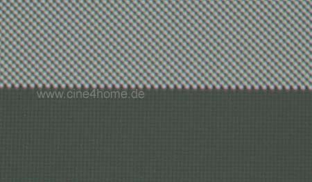 Obiges Testbild zeigt ein Gitternetz von nur einem Pixel Breite in der Makroaufnahme. Wie man sieht, sind Farbsäume so gut wie nicht auszumachen. Lediglich ein minimaler Blauschimmer nach rechts ist aus kurzen Betrachtungsabständen zu erkennen, was aber im Filmbetrieb absolut unsichtbar bleibt. In Sachen Konvergenz ist dies ein Spitzenergebnis, zu dem derzeit nur ein Single-Chip Projektor in der Lage ist. Mit dem nächsten Testbild gehen wir einen Schritt weiter: Wie gut löst der Projektor kleinstmögliche Details, sprich einzelne Pixel, auf? Dazu projizieren wir Testmuster mit nur einem Pixel Bildbreite, dies entspricht höchster FullHD-Auflösung.