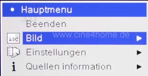 2.2 Menüs Obiger Screenschot zeigt das unscheinbare "Hauptmenü". Es ist nur in drei Kategorien, "Bild", "Einstellungen" und "Quellen-Information", eingeteilt. Besonders interessant sind wie immer die Bildfunktionen. Diese Kategorie öffnet sich mit zahlreichen bekannten Parametern.