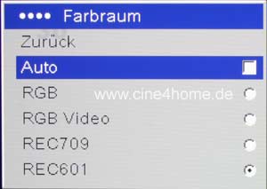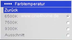 Für eine adäquate Farbreproduktion des Filmoriginals muss der Projektor neben einem normgerechten Farbraum auch den Weißabgleich aufweisen, der bei dem Video-Mastering zu Grunde lag: 6500K (D65). Neutrale Graustufen müssen also stets der recht warmen Farbtemperatur von 6500K entsprechen.