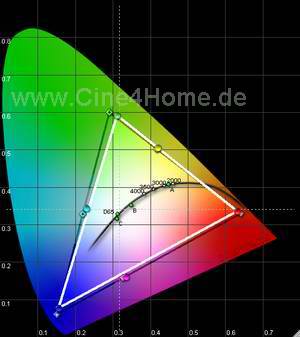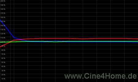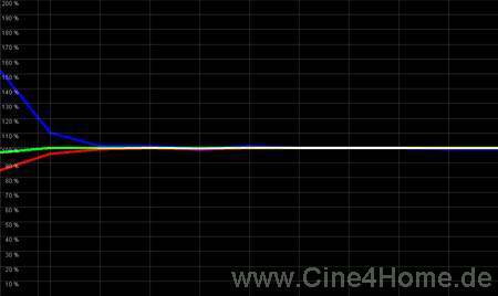 Das Ergebnis zeigt eine Präzision, wie man sie selten zu Gesicht bekommt. Schon ab 20% Helligkeit erreicht der Projektor punktgenau die D65-Norm, auch im weiteren Bereich sind keine Verschiebungen festzustellen.