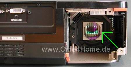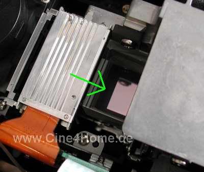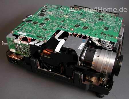 Im Bild oben ist deutlich einer der drei D-ILA Chips zu erkennen (grüner Pfeil).
