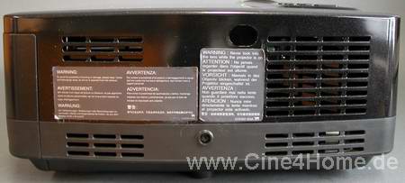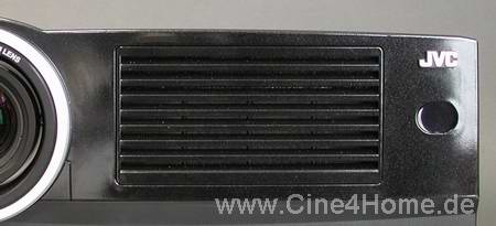 Das Belüftungssystem des HD2K ist ausgesprochen linear und einfach aufgebaut: An der Vorderseite des Projektors wird die Kühlluft angesaugt, es sind deutlich die Belüftungsschlitze neben der Optik zu erkennen.