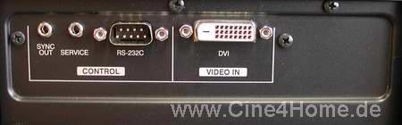 Neben drei Steuerungseingängen (einer davon eine RS232 Schnittstelle) befindet sich hier nur ein einziger DVI-Anschluss. Als Signalquelle kann jede 1080p Zuspielung dienen, im Falle unseres Tests der mitgelieferte externe Scaler. Er wiederum bietet zahlreiche Eingänge, für jede gängige Signalart einen.