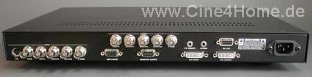 1x Composite (BNC), 1x S-Video (Hosiden), 1x YUV/RGB (4x BNC), 1x VGA (Sub-D) und 1x DVI-I mit HDCP Kopierschutzunterstützung sind als Eingänge vorhanden. Zu loben sind die BNC-Ausführungen der Stecker, die immer noch die hochwertigste und zuverlässigste Verbindungsart im analogen Bereich bieten. Wünschenswert wäre allerdings noch ein zweiter Digital-Eingang gewesen.