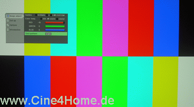 Und “last but not least“ können auch die Primär- und Sekundärfarben des Projektors schnell optisch per eingebautem Testbild untersucht werden.