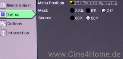 Projektoren-Menüs Die Menüs des Projektors sind in ihrer Gestaltung nahezu identisch zu denen der kleineren Modellen HX1 und SX21. Lediglich die Funktionen sind bei der HD2K-Variante auf das, was zur direkten Projektoren-Einrichtung notwendig ist, beschränkt. Das OS-Display ist optisch sehr schlicht, aber überaus übersichtlich und gut zu bedienen. In vier Hauptrubriken sind die Funktionen eingeteilt: „Image Adjust“, „Setup“, „Options“ und „Information“.