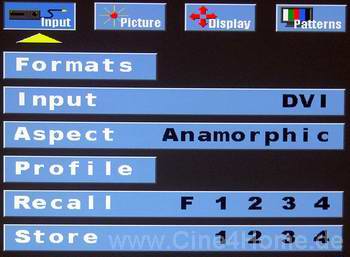 Das Input-Menü bietet neben der Eingangswahl die Formatanpassung und vier verschiedene Speicherbänke, auf denen eigene Bildkonfigurationen abgelegt werden können.