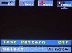 "Patterns" Wie schon der Projektor bietet auch der Scaler einen eigenen Testbild-Generator. Hier kann der Anwender weitere hilfreiche Testbilder abrufen, ohne spezielle Test-DVDs zu bemühen.