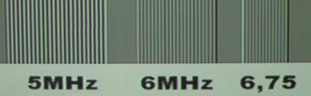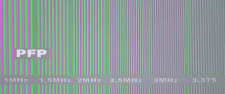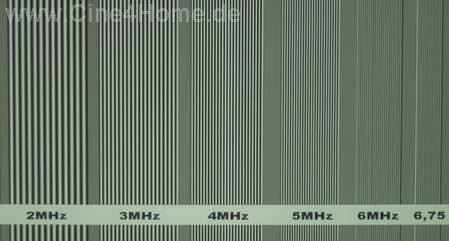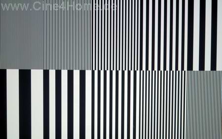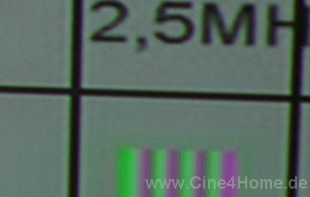 Das schwierige Bursttestsignal (Bild oben) wird absolut perfekt auf die hohe Auflösung des Projektors umgerechnet. Auch in den problematischen Auflösungsbereichen um 6MHz sind keinerlei Linearitätsschwankungen auszumachen, alle Linien erscheinen homogen gleich dick.