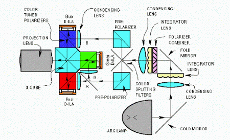Nichtsdestotrotz weiß das schlichte und geradlinige Design durchaus zu gefallen. 1.1 Technik (Know How Link hier) Bei der D-ILA Projektion handelt es sich weder um eine LCD- noch DLP-Technik im herkömmlichen Sinne. Vielmehr stellt die hier verwendete LCOS-Technologie eine Mischung aus beidem dar: Wie bei der LCD-Technologie sorgen auch hier kleine Flüssigkeits-Kristalle für die Bilderzeugung, doch werden sie nicht durchleuchtet, sondern reflektieren das Licht, ähnlich wie bei der DLP Technik. Wie bei einem LCD-Projektor handelt es sich ebenfalls um eine 3-Chip Technologie, bei der für jede Grundfarbe eines der drei Panels im Einsatz ist.