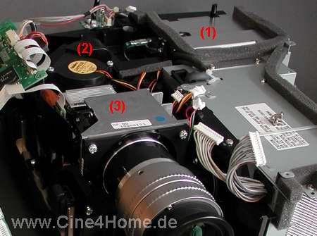 Die Lichtquelle sitzt hinten rechts, am Anfang des Lichtwegs (1). Hierbei handelt es sich um eine 250Watt Quecksilberdampflampe, wie sie für Digitalprojektoren üblich ist. Ihre Lebensdauer entspricht mit 2000 Stunden dem derzeitigen Stand der Technik.