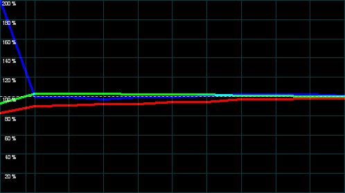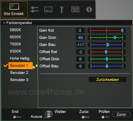 Ansonsten ist das Konzept des RGB-Menüs beibehalten worden: Die Benutzer-Bänke bieten ab Werk die maximale Helligkeit, die richtige Farbtemperatur wird durch Verringerung der einzelne Farbkanäle erzielt. Aus diesem Grunde kann man die Gain Werte lediglich in den Minusbereich regeln. Dies ist ein gutes Konzept, da so Bedienfehler vermieden werden und stets die maximale Helligkeit bei gewünschter Farbtemperatur erreicht wird. Feinjustieren kann man die Farbtemperatur zusätzlich im Gamma-Untermenü, das ebenfalls für alle Grundfarben einzeln wählbar ist.