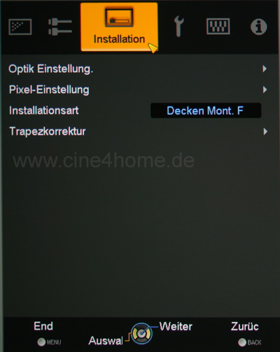 Die dritte Hauptkategorie beinhaltet alle Funktionen zur Installation: Hier kann man Schärfe und Zoom justieren, (wenn unvermeidbar) den Trapez ausgleichen und die Konvergenz des Projektors nachjustieren.