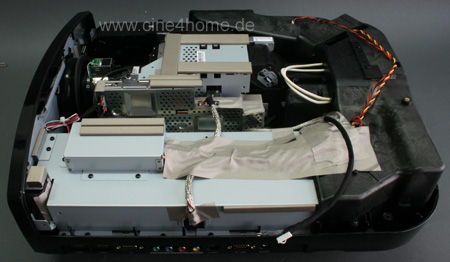 Nimmt man auch diese Steurplatine ab, gelangt man schließlich zum eigentlichen Herzen, dem internen Lichtweg, in dem das Bild erzeugt wird. Ein Deckel mit montierten Spiegeln gibt einen ersten Überblick über die Lichtführung.