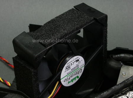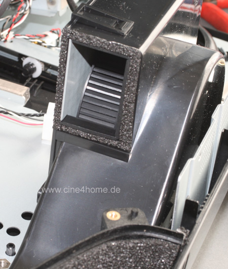 Nachdem die Kühlluft ihre Arbeit verrichtet hat, wird sie in den Hauptabluftkanal geleitet und verlässt zusammen mit der erwärmten Lampenluft seitlich den Projektor. Dieses duale Belüftungssystem arbeitet angenehm leise und stört den Filmbetrieb nicht. Lediglich im hohen Lampenmodus werden sie geräuschempfindliche Kinofans evtl. nach wie vor in ruhigen Filmszenen wahrnehmen können.
