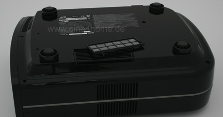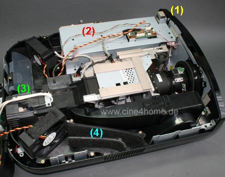 Die Außenluft wird vorne links am Projektor durch einen unauffälligen Luftschlitz angesaugt (1). Gefördert durch einen großen, leisen Lüfter im hinteren Teil, kühlt die Luft zunächst Netzteil und Signalplatine (2). Danach wird sie U-förmig durch das Lampenmodul (3) geleitet. Abschließend fördert ein zweiter großer Lüfter die erhitzte Luft seitlich rechts wieder aus dem Gerät heraus (4). Der gesamte Luftkanal ist dabei gewissenhaft mit Schaumstoff abgedichtet, so dass keine Fremdluft angesaugt werden kann und Licht und Schall ebenfalls im Inneren verbleiben: