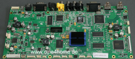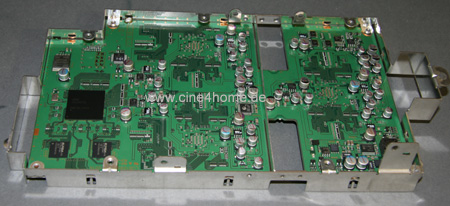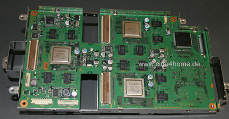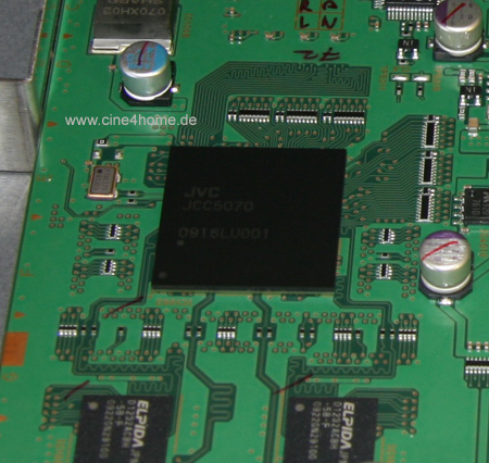 Die Steuerprozessoren wurden gegenüber dem Vorgängermodelldurch leistungsfähigere Varianten ersetzt. Der Grund ist die 120Hz-Zwischenbildberechnung: Die neuen Prozessoren sind nun in der Lage, "schnellere" Eingangsfrequenzen zu verarbeiten und die D-ILA Panels entsprechend anzusteuern. Mit dieser Platine haben wir auch endlich das Herz der Zwischenbildberechnung aufgespürt, dazu müssen wir sie nur einfach umdrehen.