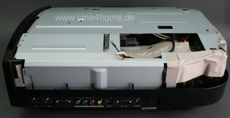 Entfernt man auch diese Steuerplatine, gelangt man schließlich zum eigentlichen Herzen, dem internen Lichtweg, in dem das Bild erzeugt wird. Ein Deckel mit montierten Spiegeln gibt einen ersten Überblick über die Lichtführung.