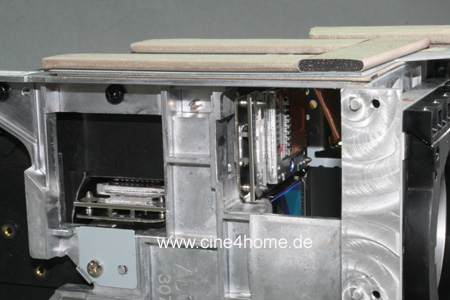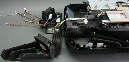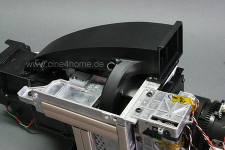 Wie schon erwähnt: Da es sich bei D-ILA um ein reflketives System handelt, sprich die einzelnen LCDs nicht durchleuchtet werden, sondern das Licht wie ein Spiegel zurückwerfen, reicht eine Kühlung der Rückseite. Dies erhöht den Staubschutz signifikant, da keine Kühlluft in den eigentlichen Lichtweg gelangt. Tatsächlich sind D-ILA Projektoren die staubsichersten am Markt, so gut wie nie gibt es Reklamationen wegen Staubkörnern im Bild. Deutlich wird dies, wenn man den Luftschacht abmontiert, dahinter kommen die Kühlkörper der einzelnen LCOS-Panel zum Vorschein: