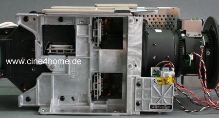 Öffnet man schließlich auch diesen letzten Deckel, erhält man einen beeindruckenden Ausblick auf den vertikal im Projektor sitzenden Lichtweg. Wir haben ihn beleuchtet, um die Aufspaltung des weißen Lampenlichtes in seine Grundfarben anschaulich zu erläutern: