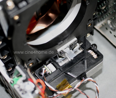 Das zusammengefügte, farbige Bild verlässt den Projektor durch eine gemeinsame Optik, die aus dem Hause Fujinon stammt. Auch sie ist hervorragend verarbeitet, so besteht ihr Gehäuse z.B. komplett aus Metall und nicht, wie sonst bei Heimkinoprojektoren üblich, aus Plastik.