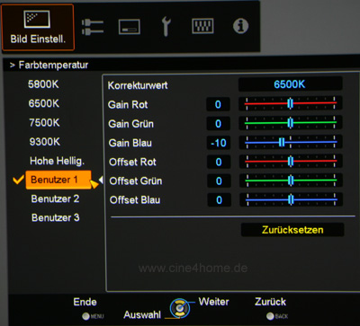 Neben den voreingestellten Werks-Presets bieten dei Benutzer-Bänke die Möglichkeit, die Farbtemperatur selbst zu kalibrieren. Und während man bei den Vorgängern HD350/750 noch stets eine komplette Kalibrierung ausgehend von der nativen (viel zu kühlen) Farbtemperatur des Beamers durchführen musste, so kann man beim 550/950 nun den passenden "Korrekturwert" auswählen (in der Regel 6500K) und ausgehend von dieser Voreinstellung ein Feintuning vornehmen. Das erspart Zeit und ermöglicht perfekte Ergebnisse. Es scheint, als hätten sich die Ingenieure unsere Kritik im damaligen Test zu Herzen genommen...