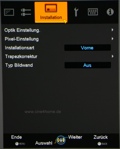 Die dritte Hauptkategorie beinhaltet alle Funktionen zur Installation: Hier kann man Schärfe und Zoom justieren, (wenn unvermeidbar) den Trapez ausgleichen und die Konvergenz des Projektors nachjustieren.