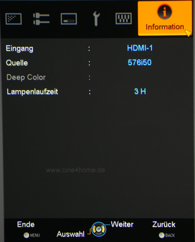 Es verbleibt der "Info"-Screen, in dem man selbst keine Einstellungen vornehmen, jedoch ablesen kann, welche Signalart gerade eingespeist wird. Neben Auflösung und Frequenz wird sogar die ausgegebene Bit-Tiefe angezeigt.
